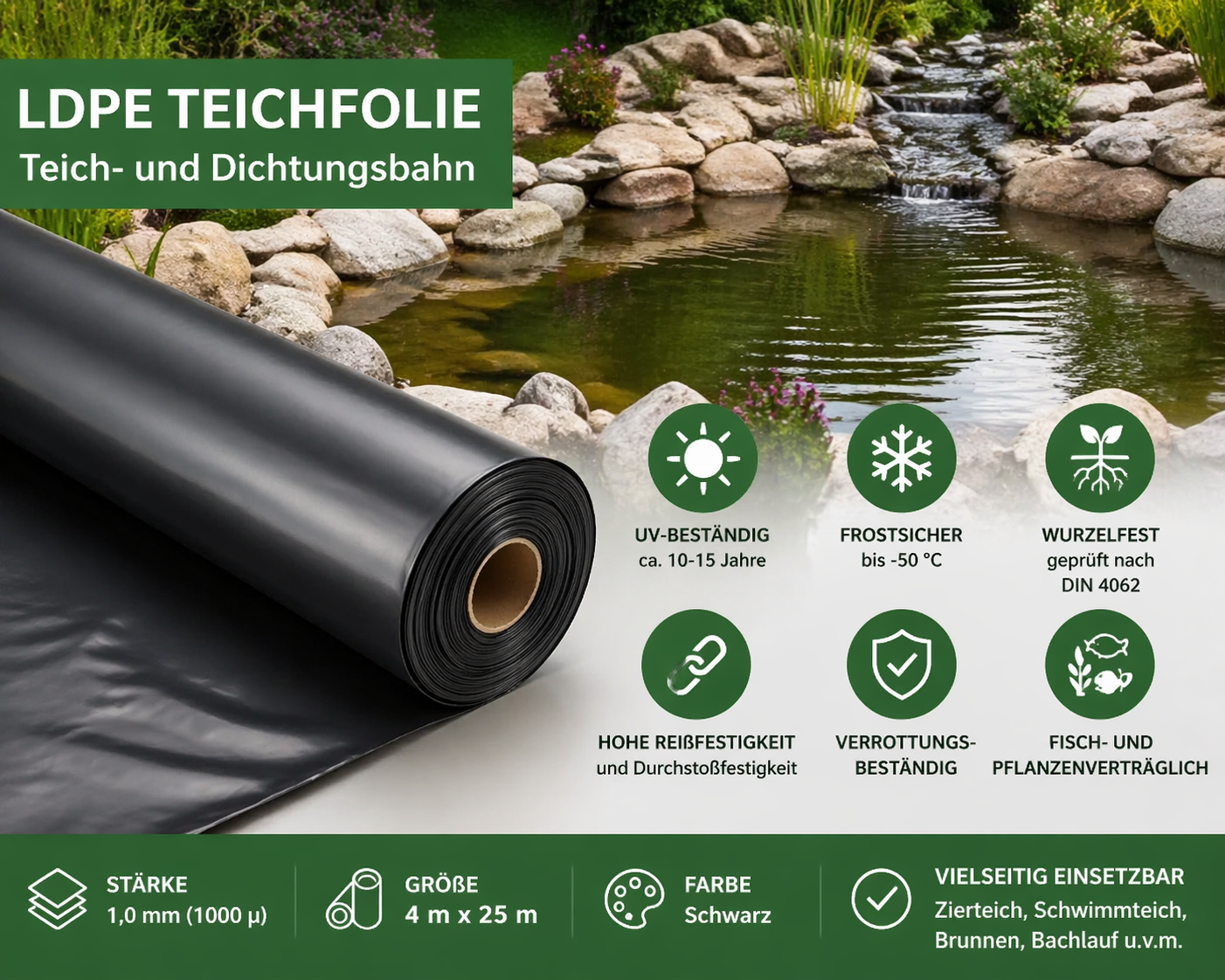 Die hochwertige LDPE Teichfolie in 6 m Breite und 25 m Länge bietet eine professionelle Lösung für die dauerhafte Abdichtung von Gartenteichen, Schwimmteichen, Bachläufen, Brunnen und weiteren Wasseranlagen. Durch ihre hochelastische Struktur lässt sie sich einfach verlegen und passt sich flexibel jeder Teichform an.
