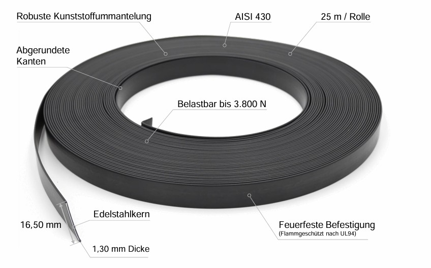 Das Stahlspannband ist mit einer hochwertigen, flammhemmenden Kunststoffbeschichtung (V2 nach UL94) versehen, die zahlreiche Vorteile für industrielle und gewerbliche Anwendungen bietet.